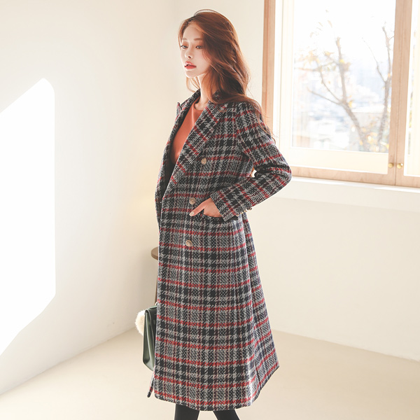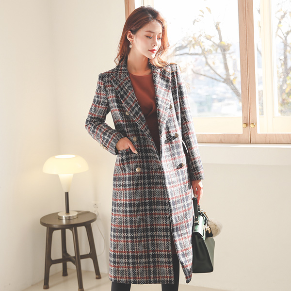 Winter Tweed Check Gold Button Wool Long Coat