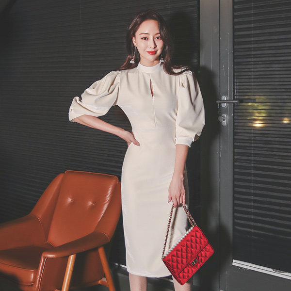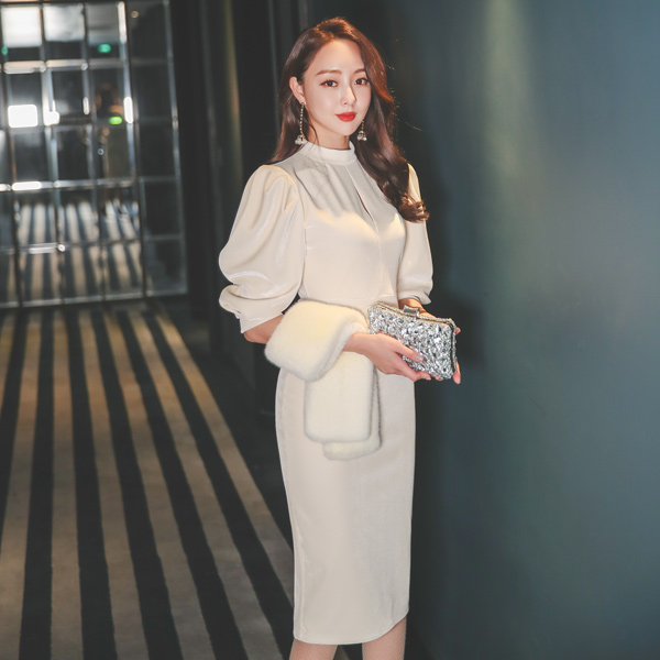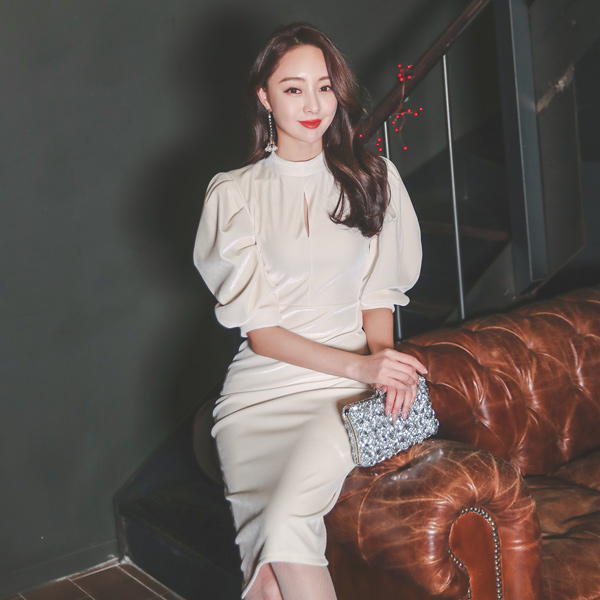 Velvet Balloon Sleeves Slit-Neck Span Dress
