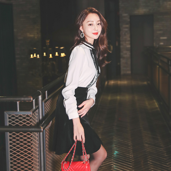 Frill Lace Ribbon-Tie Velvet Color Combination Dress