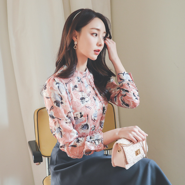 High-Neck Jacquard Feather See-through Blouse