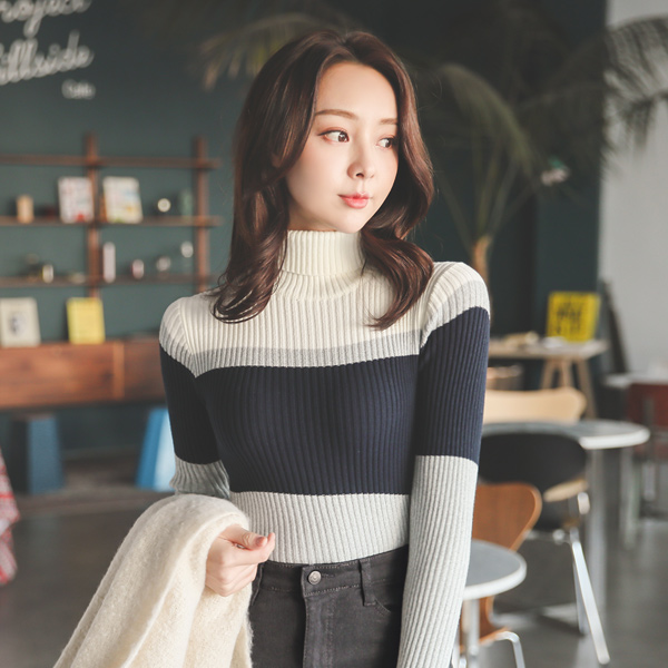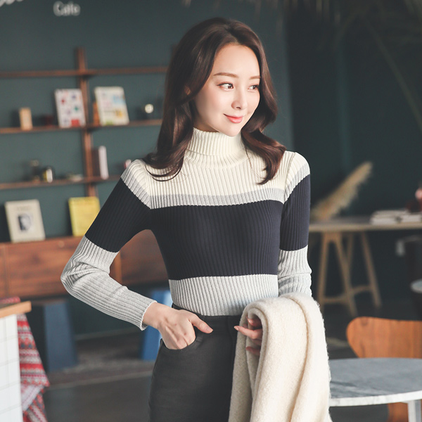 Soft Triple Color Combination-line Corduroy Turtleneck Knit