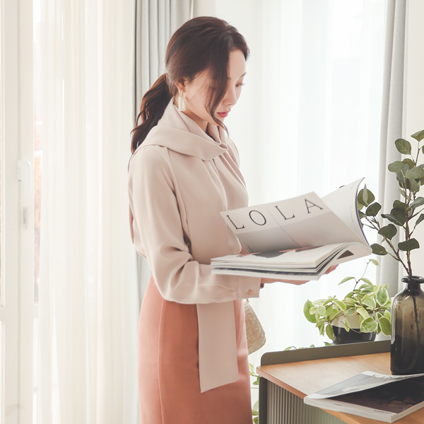Pintuck Center Front Vent Roll-Neck Tie SET Blouse