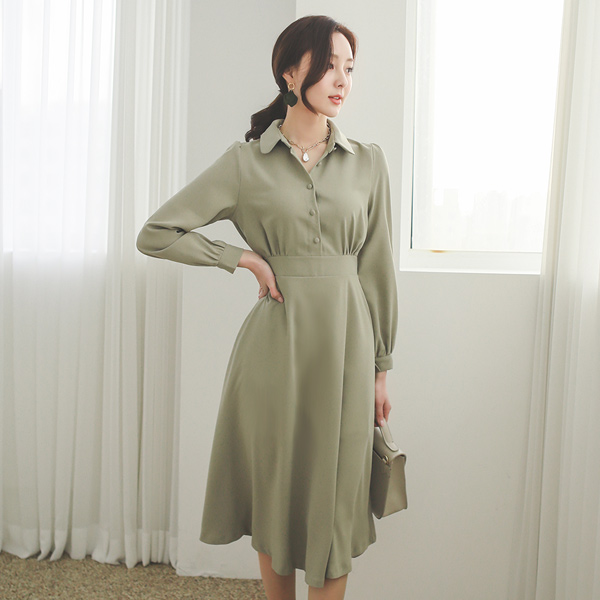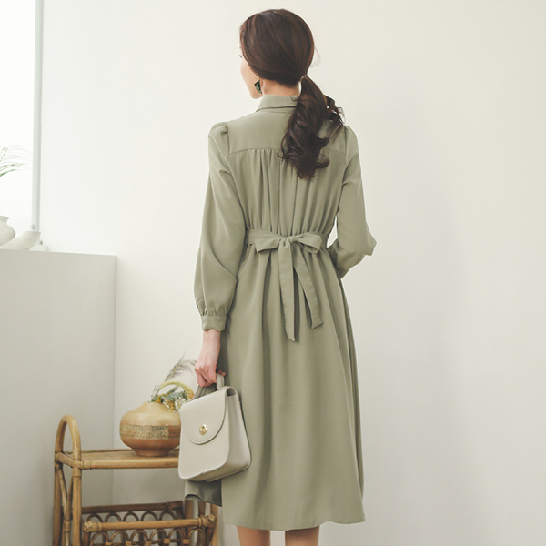Rounding Collar Back Ribbon Bean Button Flared Dress