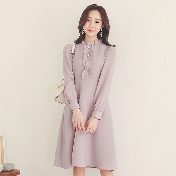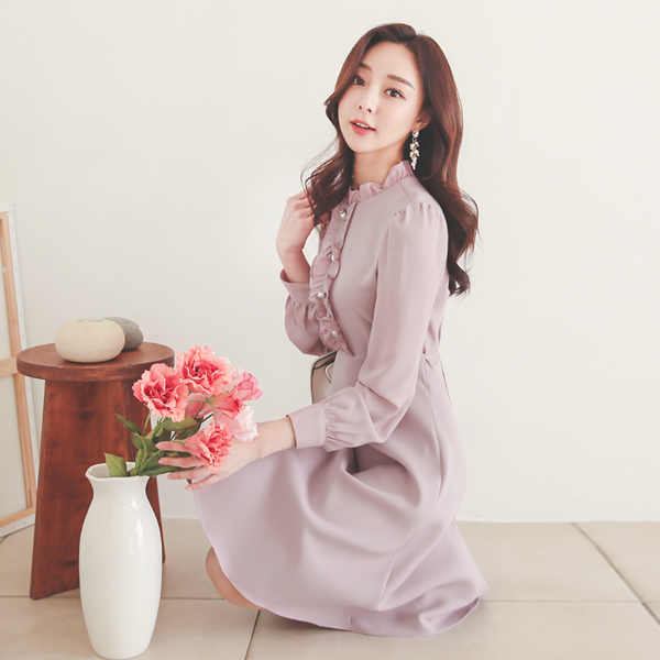 Frill Neck Pearl Button Flared Dress