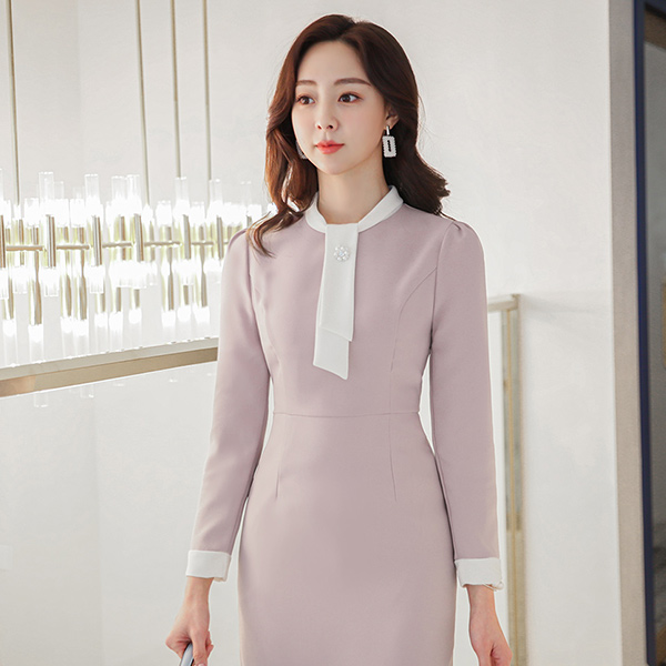 Color Combination Tie Neck Pearl Trimming Slim Dress