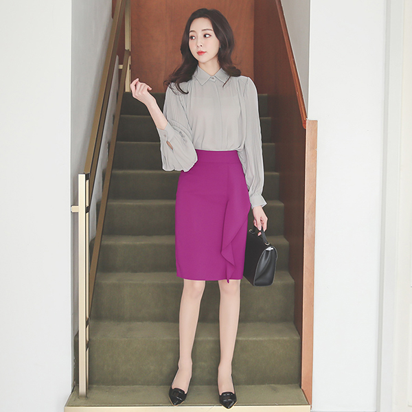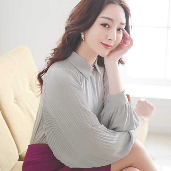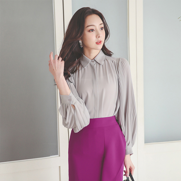 Pleats Puff Sleeves Hidden Button Blouse