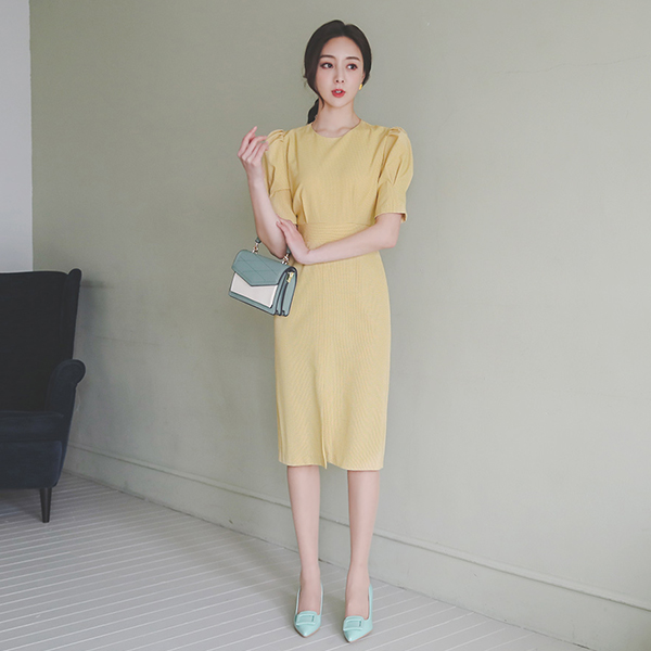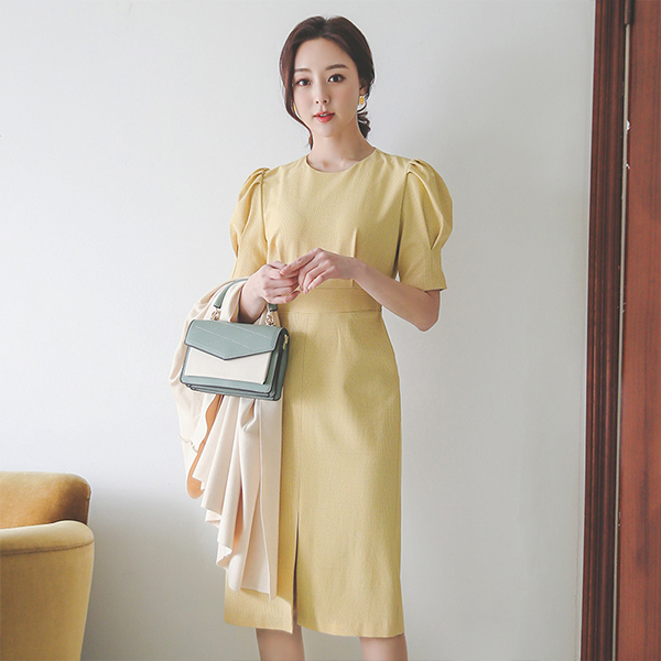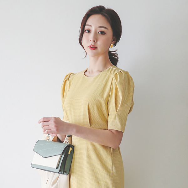Pintuck Puff Slit Back Banding Check Dress
