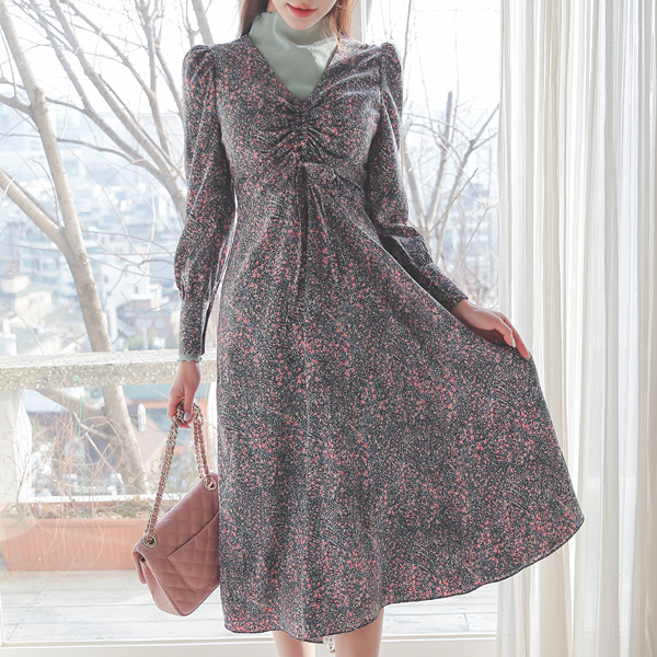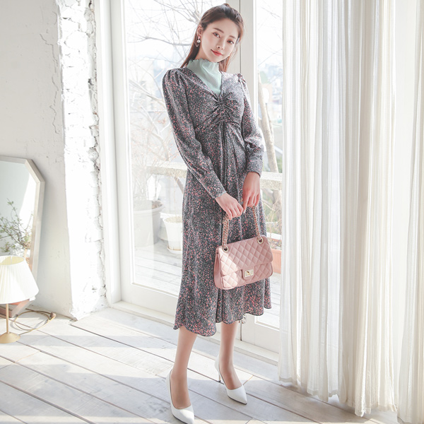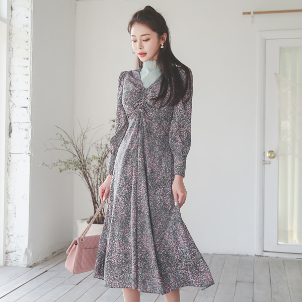Floral Gather Shirring String V-neck Long Dress