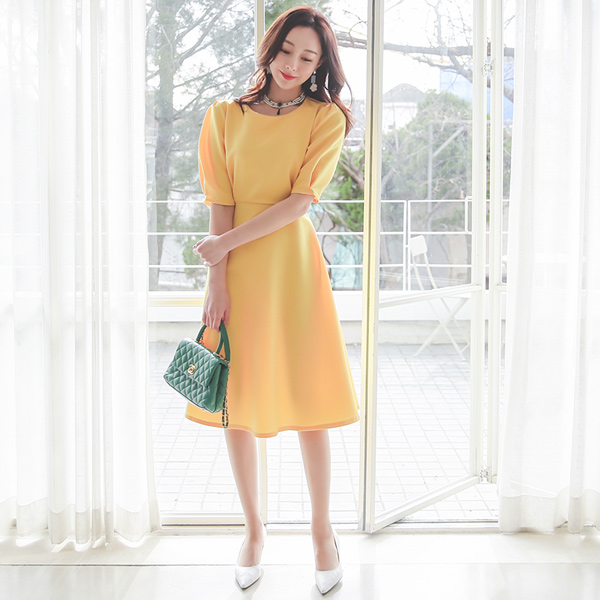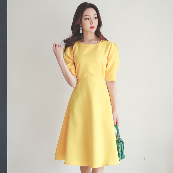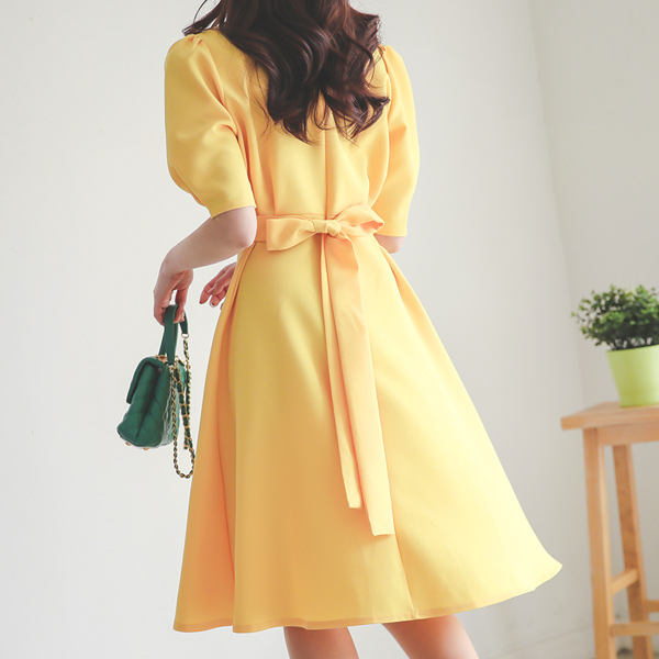 Back Ribbon Round Shoulder Shrring Flared Dress