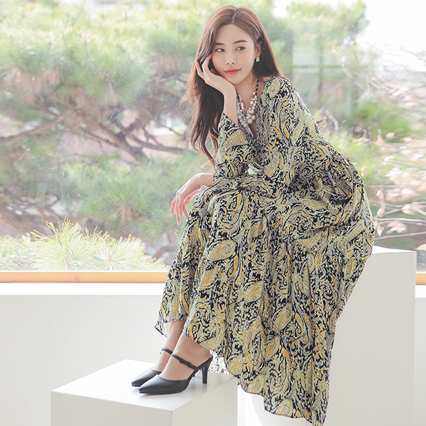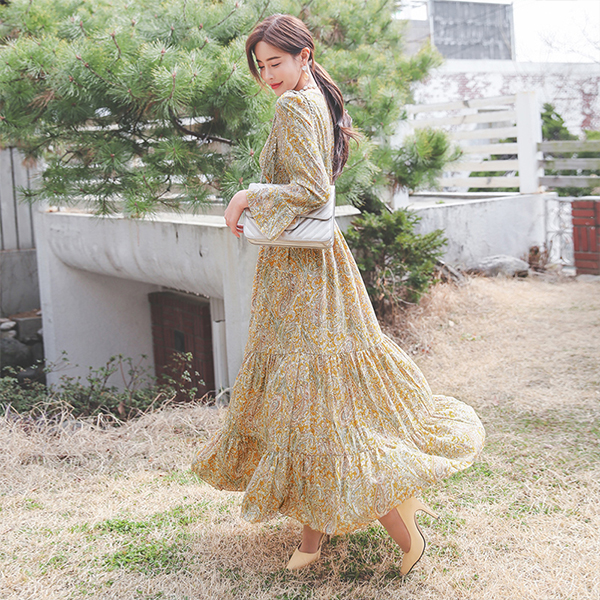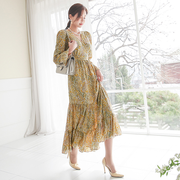 Tea Tree Paisley Wrap V-neck Banding Long Dress