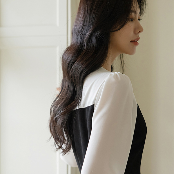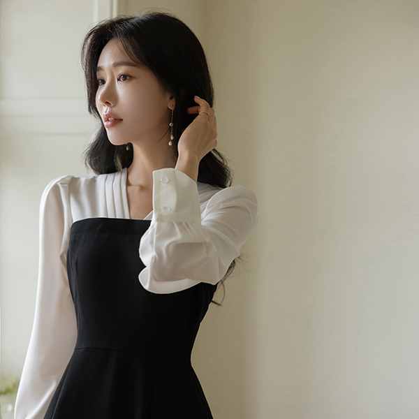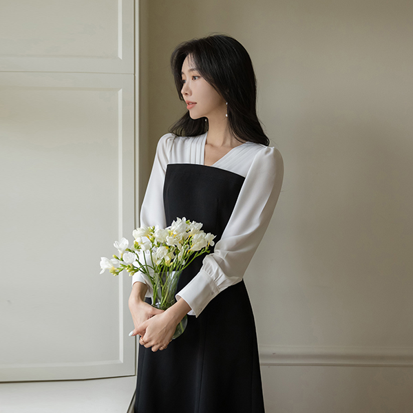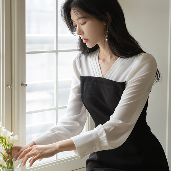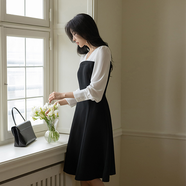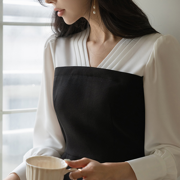 Pintuck V-neck Chiffon Color Combination Flared Dress