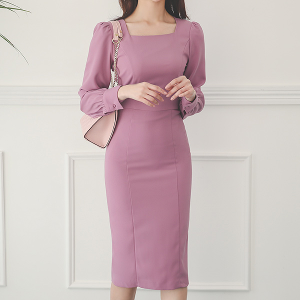 Square Neck Shoulder Shirring Cutting-line Midi Dress