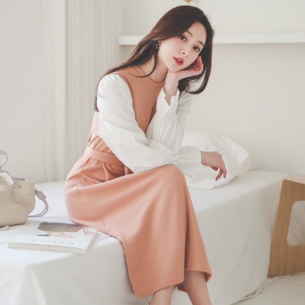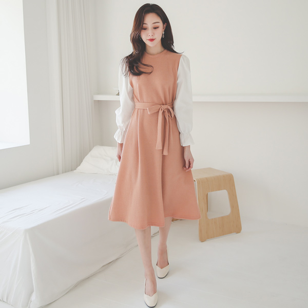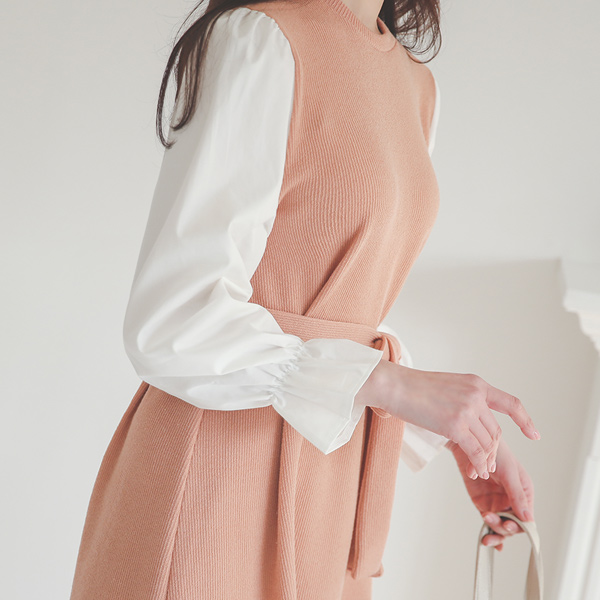 Cotton Sleeves Color Combination Knit Flared Dress