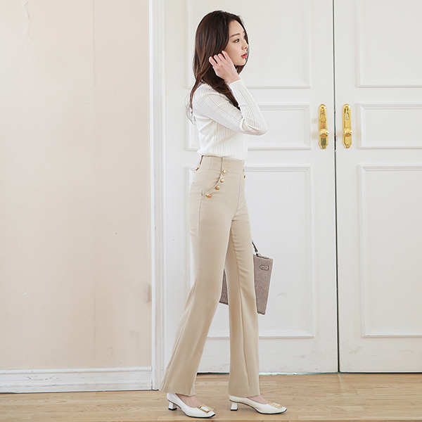 High-Waist Gold Ring Button Luxury Boot-Cut Slacks