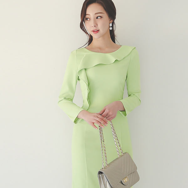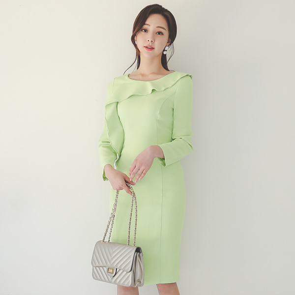 Rounding Unbalance Ruffle Line Cutting Slim Dress