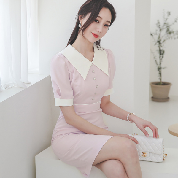 large Flat Collar Piping Color Combination Pearl Buttons Dress