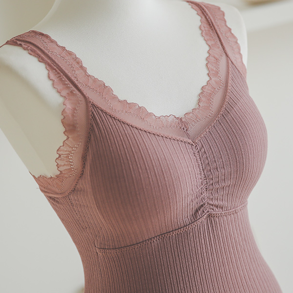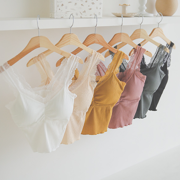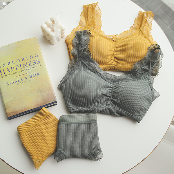 Lace Trimming Shirring Corduroy Bralette&Briefs SET