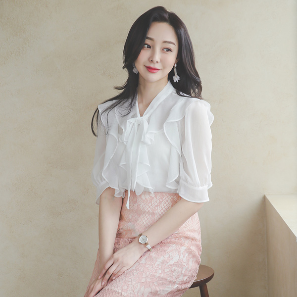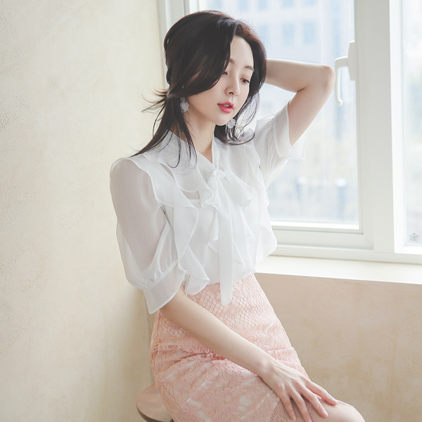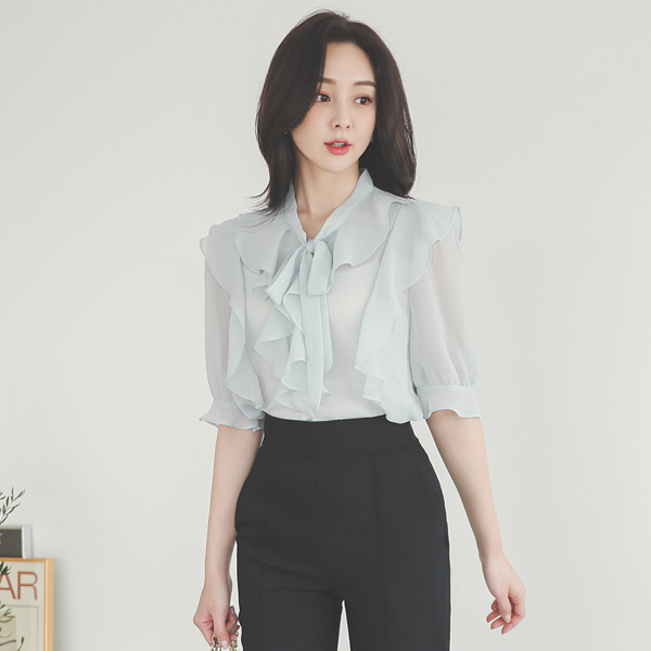 Cancan Frill Chiffon Tie Blouse(short sleeves)