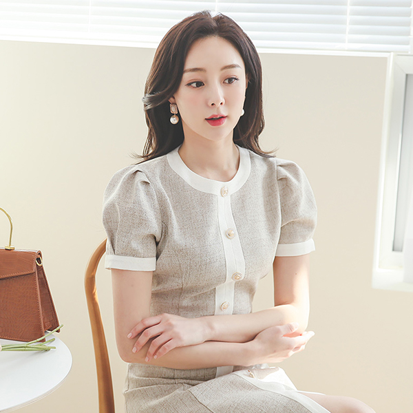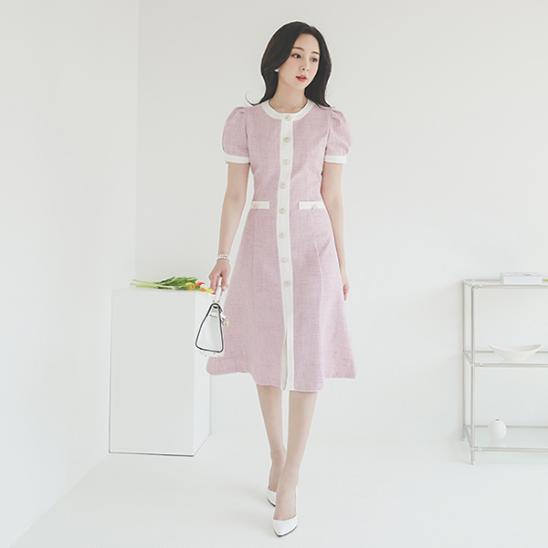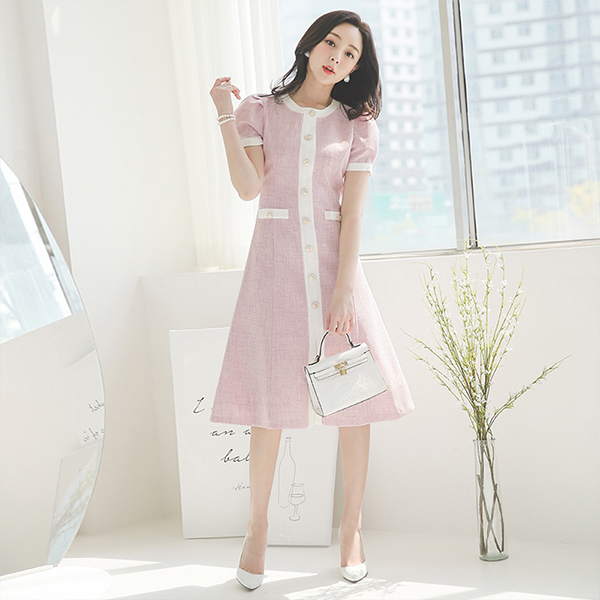 Linen quality Color Combination-line Flared Dress