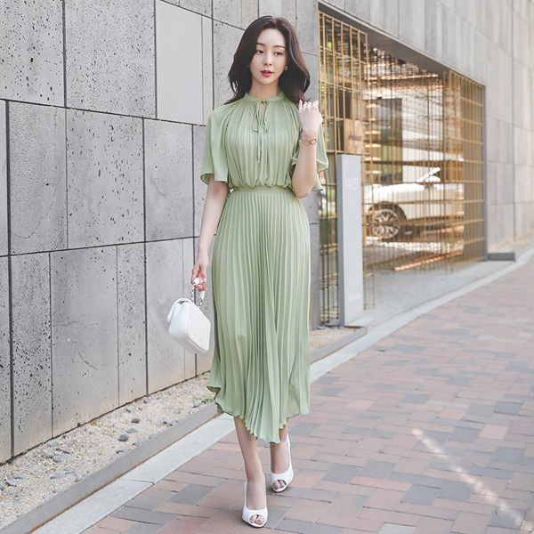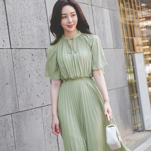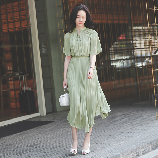 wing Sleeves Banding Pleats Chiffon Long Dress