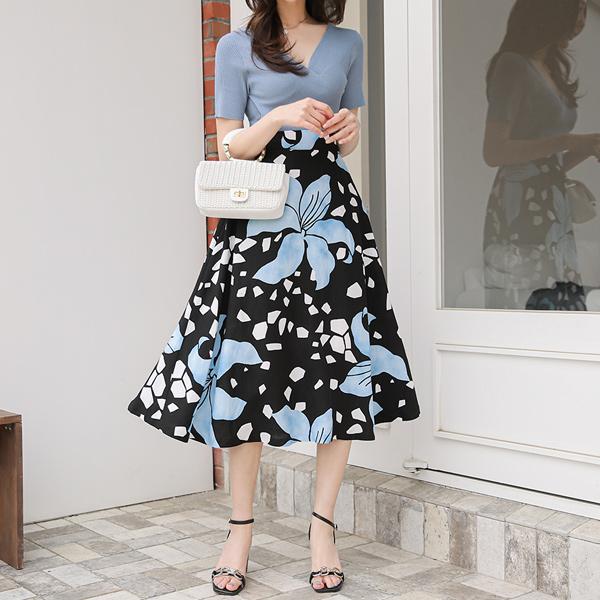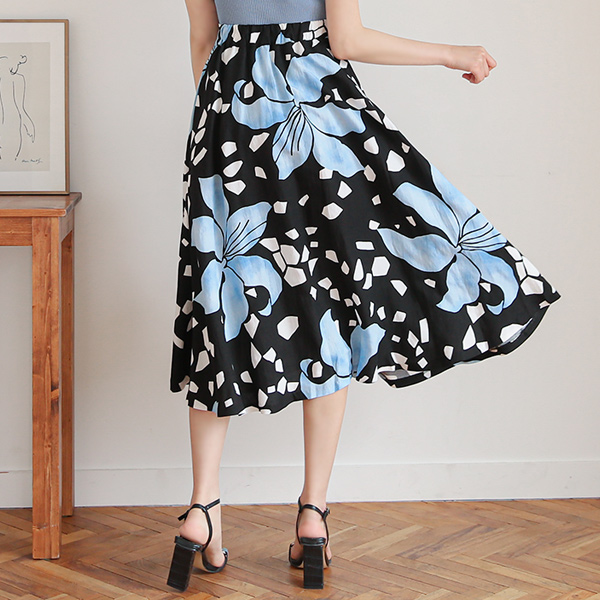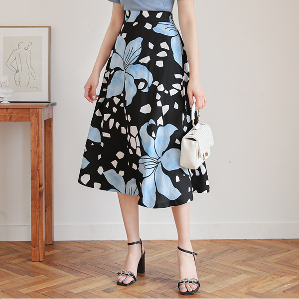 Piece Flower Printing Back Banding A-line Linen Skirt
