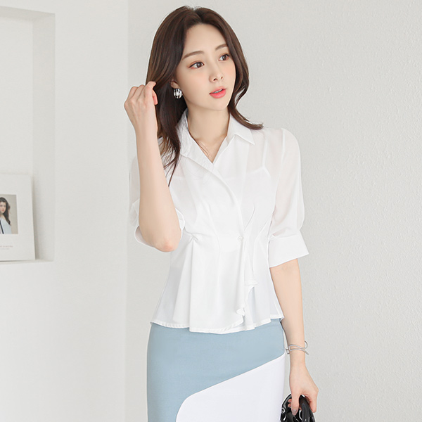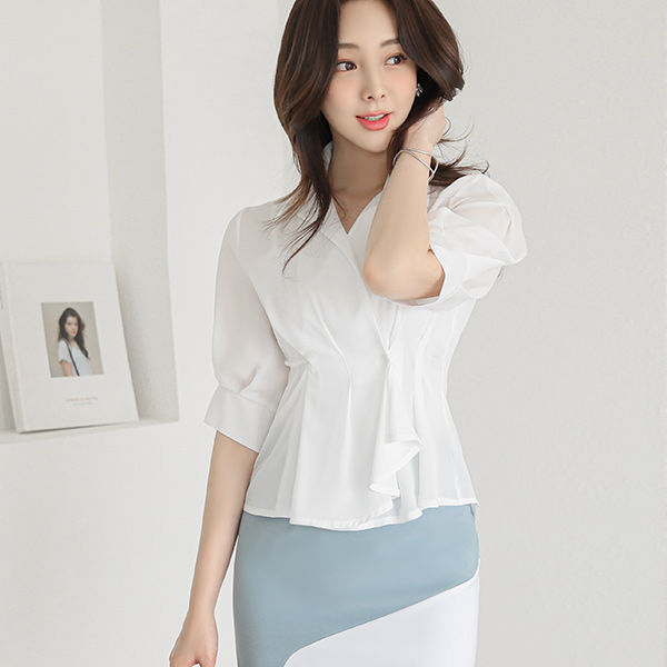 Volume Pintuck Sleeves Shirring Wrap Peplum Blouse