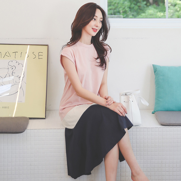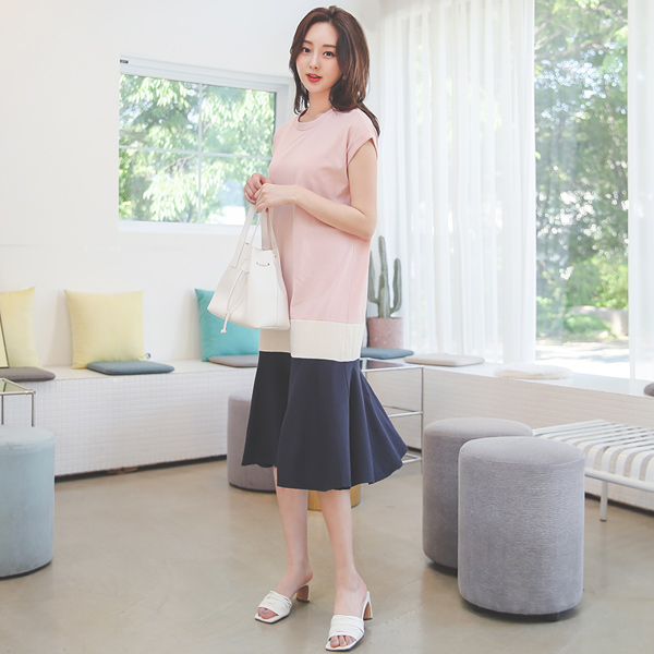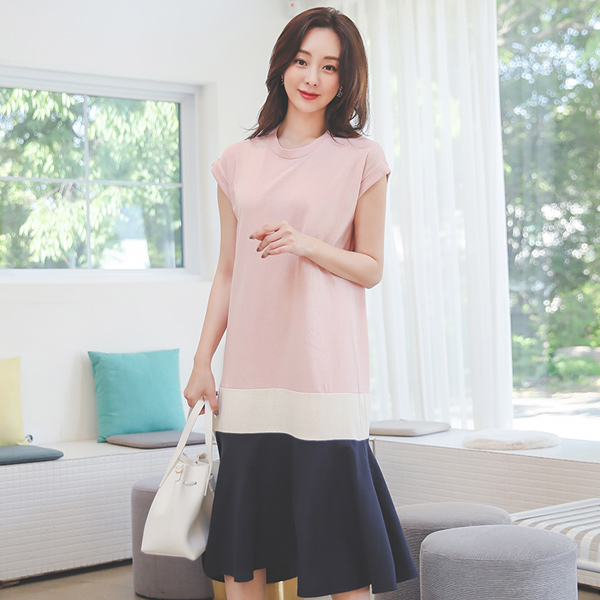 Roll-up Cap-Sleeves 3Pieces Color Combination Cotton Dress