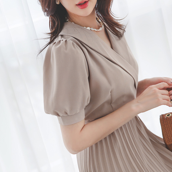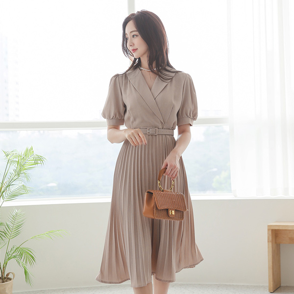 Shawl Collar Puff Belted Pleats Dress