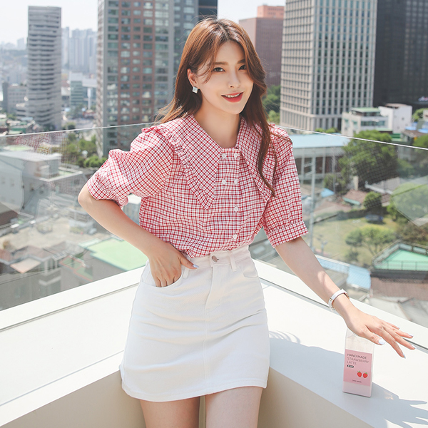 Sailor Collar Unbalance Double-button Check Blouse