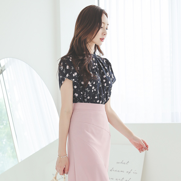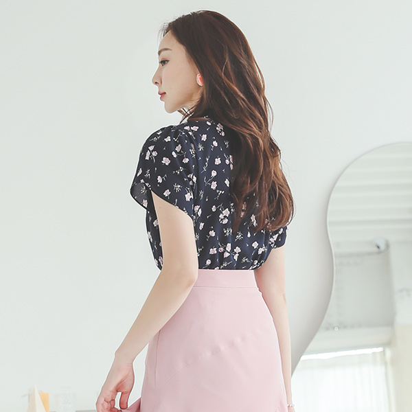 Floral Shirring Pearl Collar Tulip-Sleeves Blouse