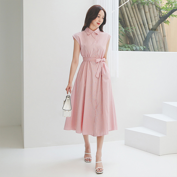 Stripe French Sleeves Belted Long Shirts Dress