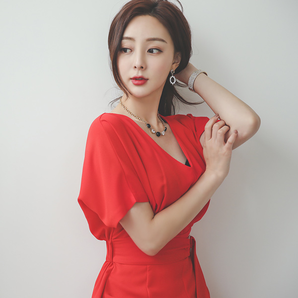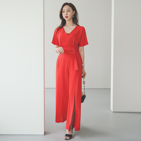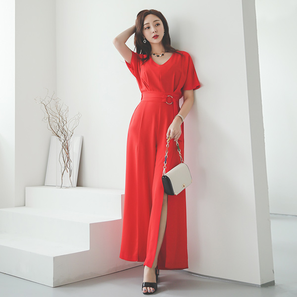 Gold-Ring Belted Pintuck Deep-Slit Wide Jumpsuit