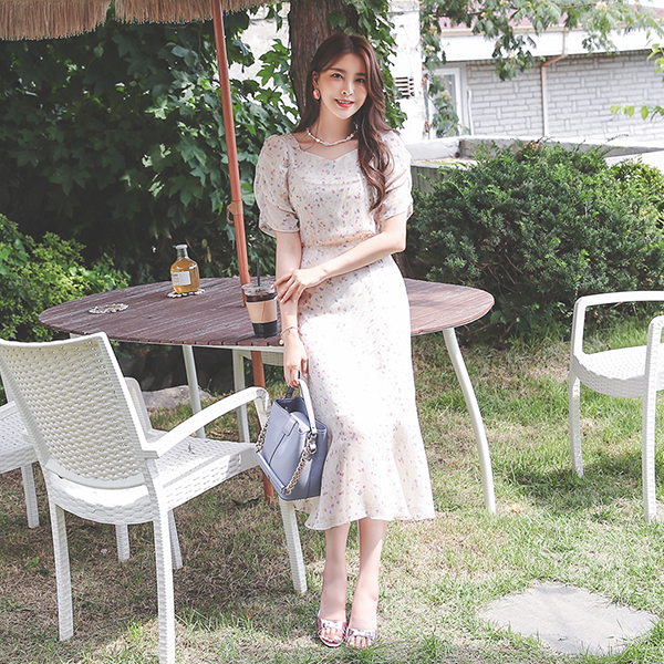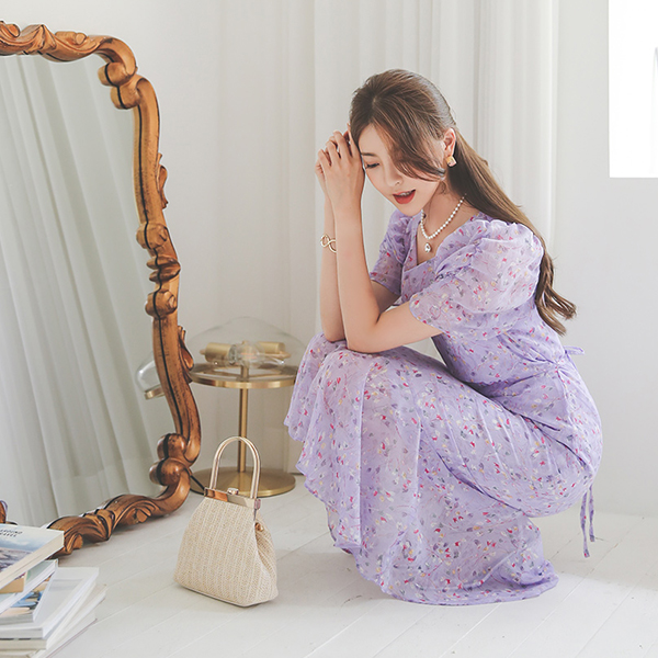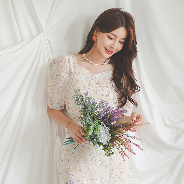 Blooming Square Neck Shirring-Sleeves Ruffle Chiffon Dress