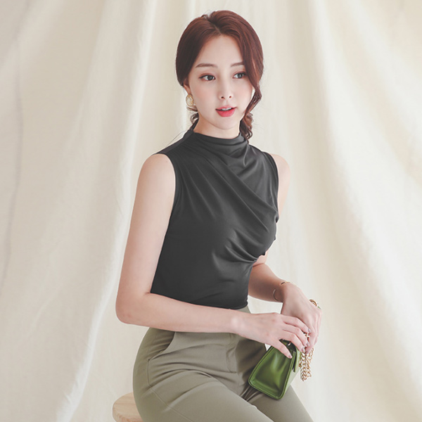 Unbalance Shirring Silket Span High-Neck Sleeveless T-shirt