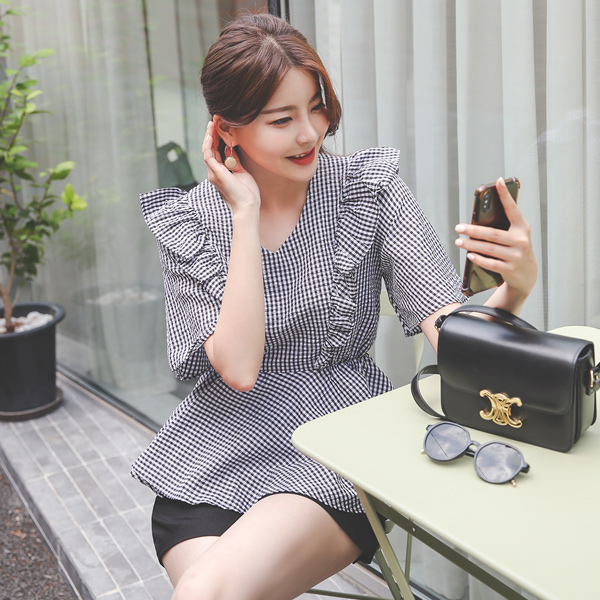 Welly Gingham-Check Ruffle Banding Flared Blouse