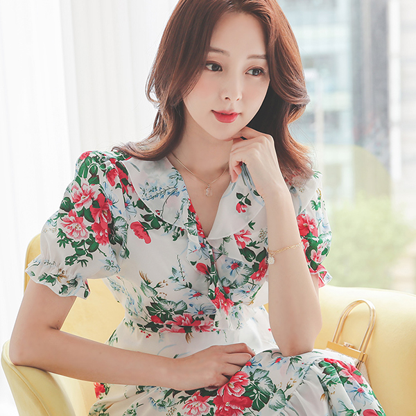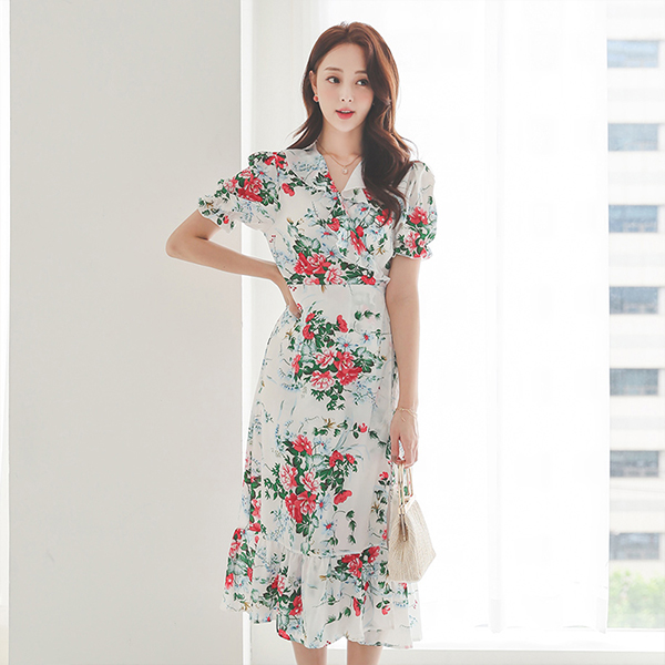Ruffle Neck Camellia Wrap Chiffon Dress