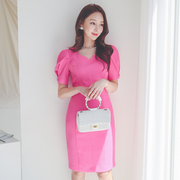 Heart Neck Pintuck Puff Cutting-line Dress