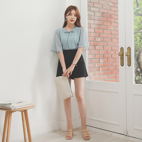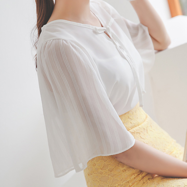 Ice Wrinkle See-through Wing Sleeves Ribbon Blouse