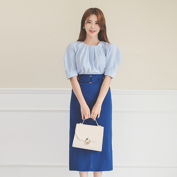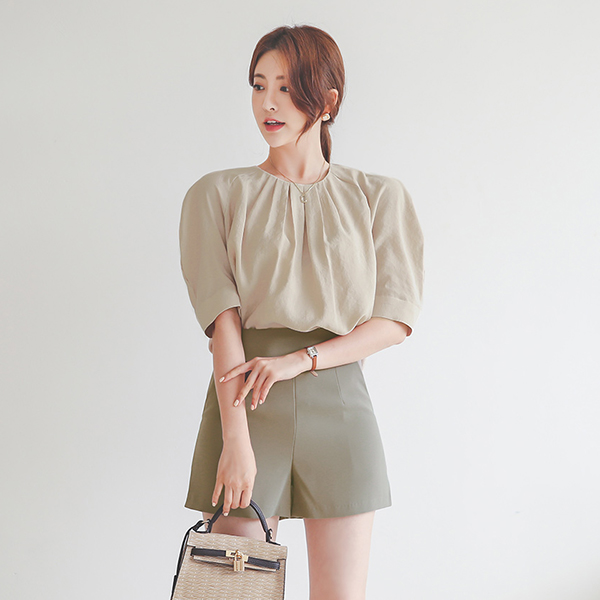 Skily Wrinkle Balloon Sleeve Pintuck Round Blouse