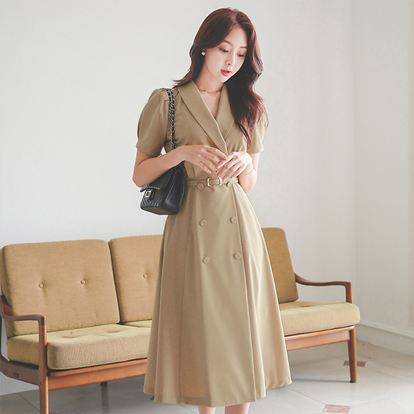 Shawl Collar Puff Gold Tip Point Double Button Dress