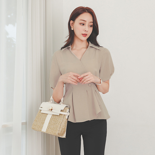 Open-Collar Puff Wrap Flared Blouse