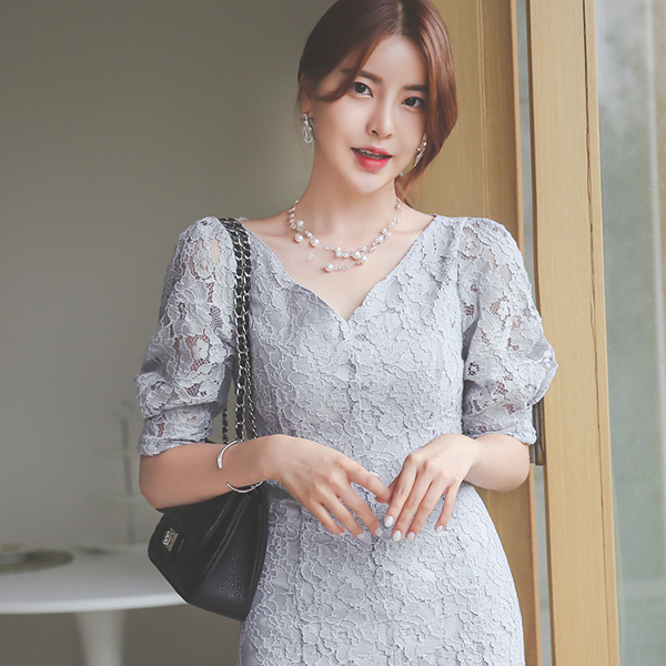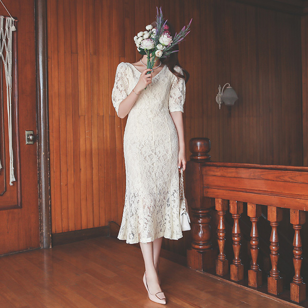 Heart Neck Lace Puff Mermaid Dress