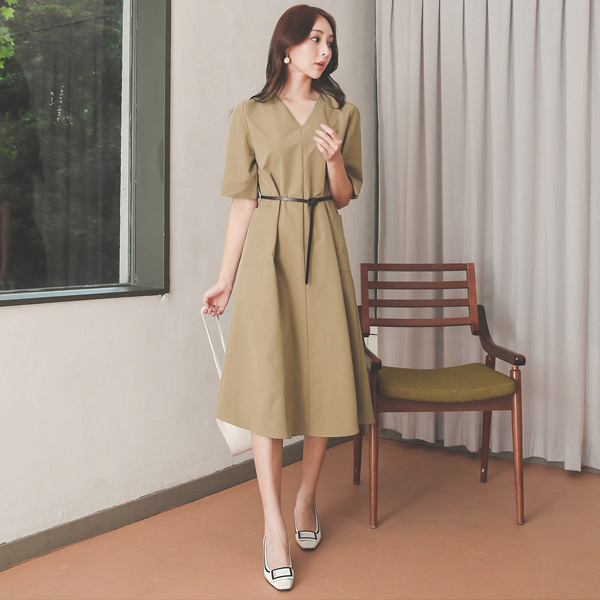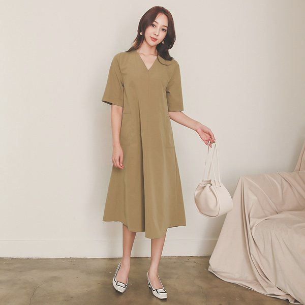 Big Pocket Cutting A-line V-neck Dress