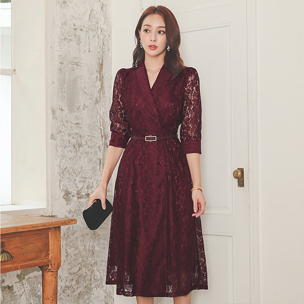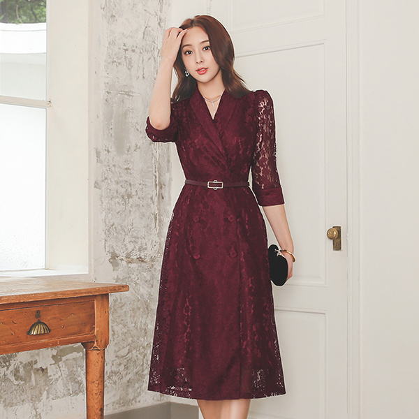 Shawl Collar Lace Double-button Flared Dress