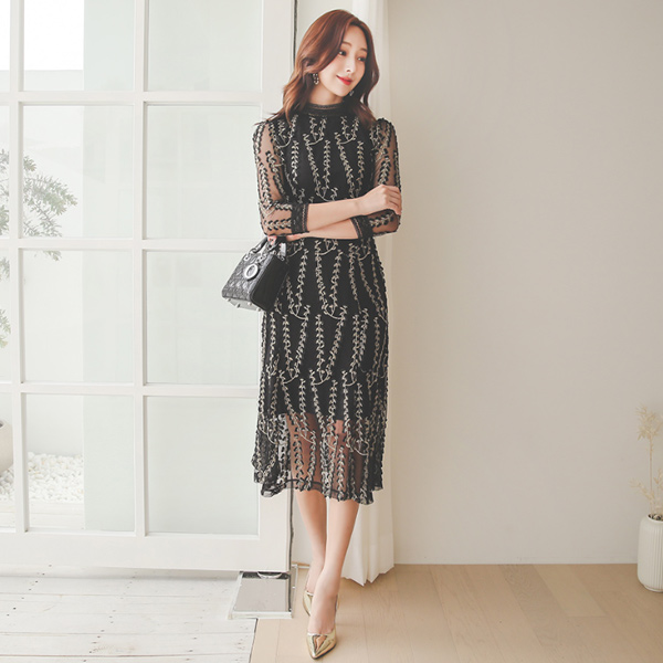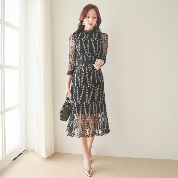 Gold Leaf Embroidery Lace See-through Dress
