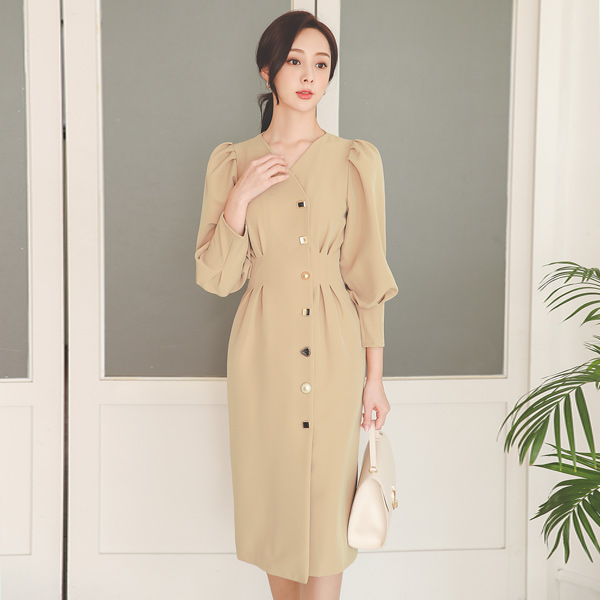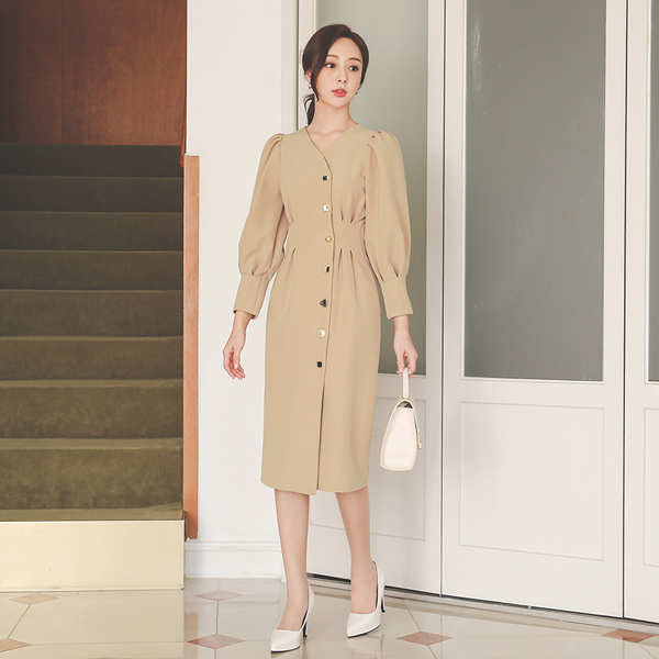 Lady Puff Pintuck Button Span Dress