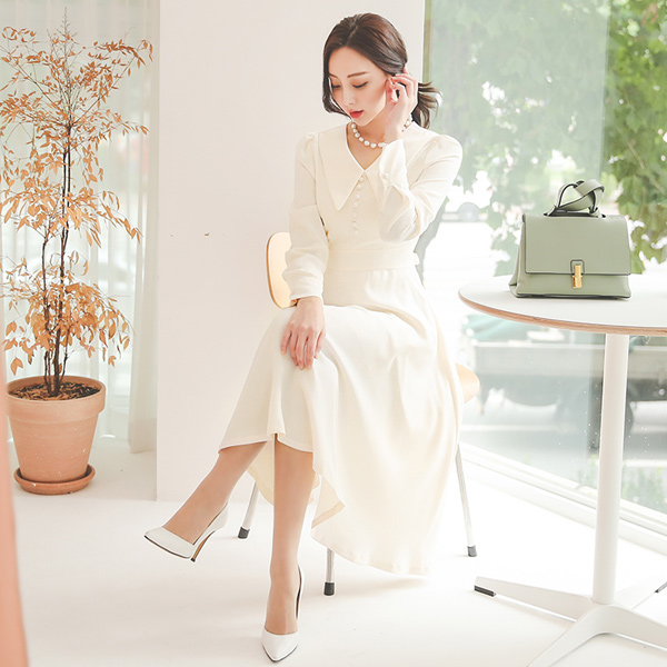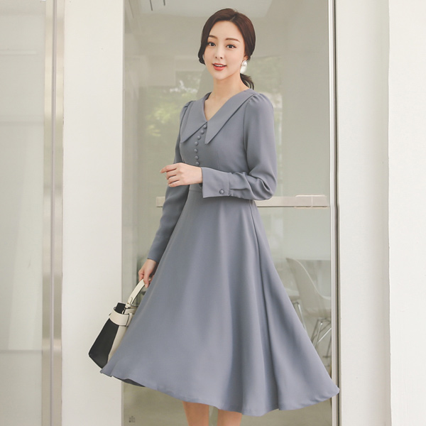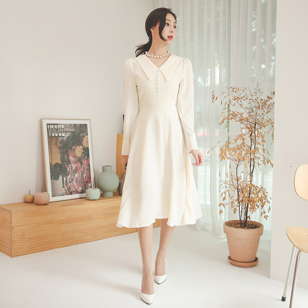 Big Collar Bean Button Back Ribbon Flared Dress