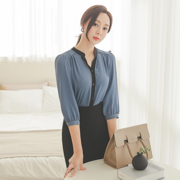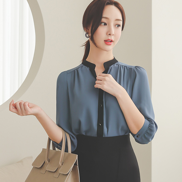 Half-Open Chinese Color Combination Gather Shirring Blouse