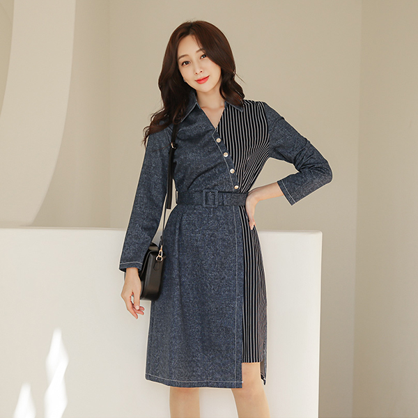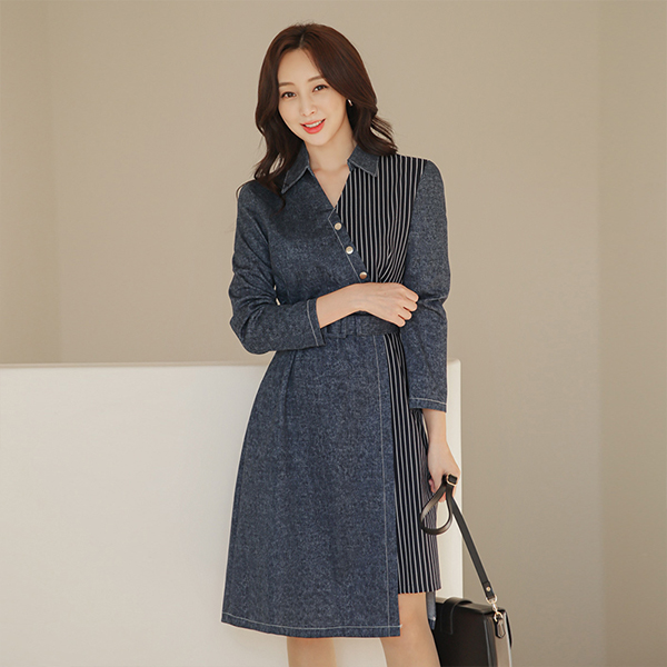 Stripe Color Combination Span Denim Collar Shirt Dress