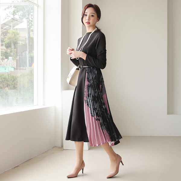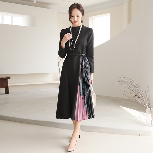 Elegance Satin Pleats Color Combination Funnel Neckline Dress